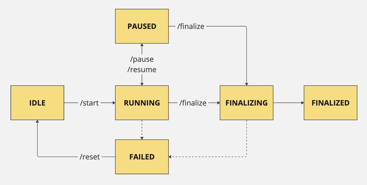 You operate with Percona ClusterSync for MongoDB using the set of commands or API calls. Depending on the request it receives, Percona ClusterSync for MongoDB has several states as shown in the following diagram: